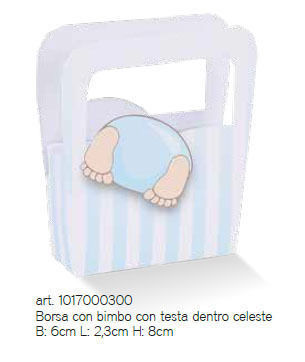 Scatoline portaconfetti a forma di borsetta celeste con bimbo e piedini decorative della linea Spacco, ideali per confezionare bomboniere e confetti per nascita e battesimo.