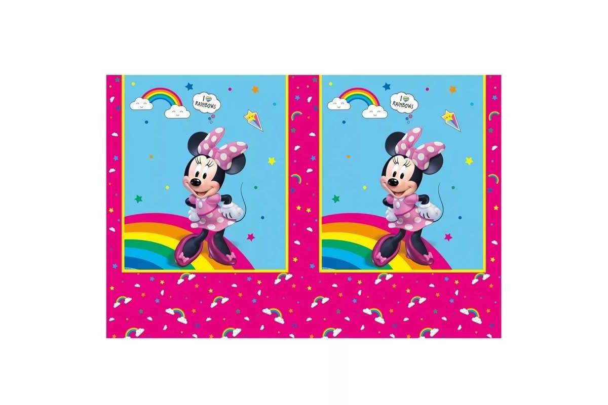 Tovaglia rettangolare in carta 120x180 cm con Minnie Rainbow Make Me Smile, perfetta per decorare la tavola di feste e compleanni a tema Minnie.