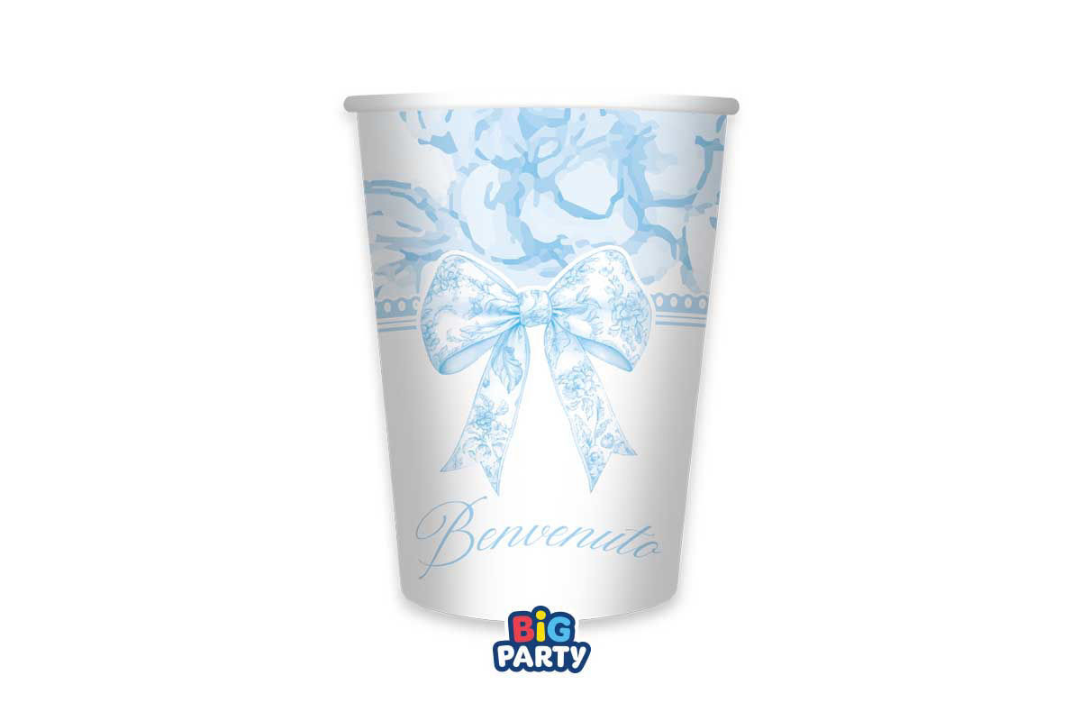 Bicchieri in carta “Benvenuto” con fiocco stile vintage da 250 cc, ideali per baby shower e nascita, firmati Big Party.