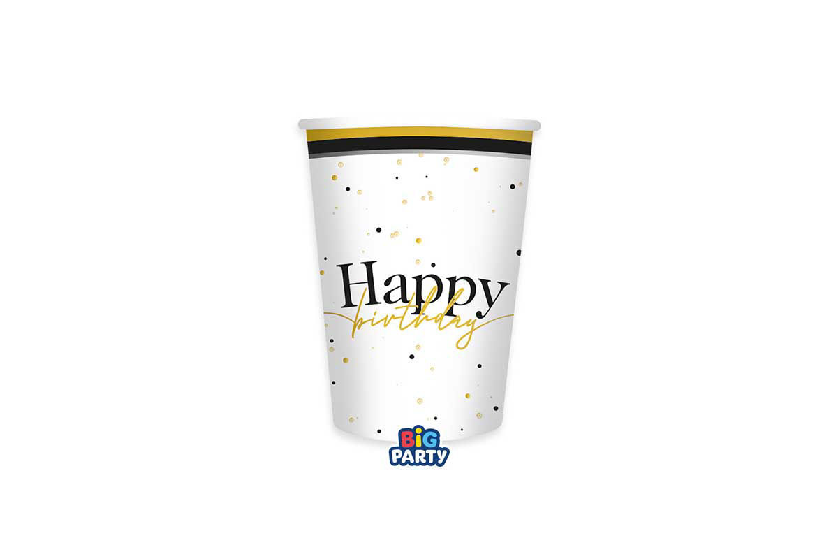 Bicchieri in carta “Happy Birthday” linea Prestige da 250 cc, ideali per feste di compleanno eleganti, firmati Big Party.