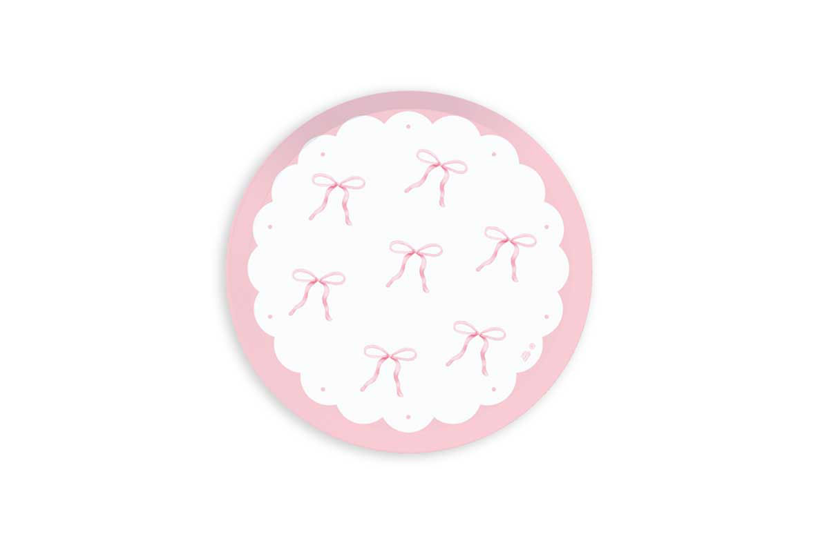 Piatti in carta “Pink Bow Party” con fiocco rosa da 18 cm, ideali per feste eleganti e allestimenti femminili, firmati Big Party.