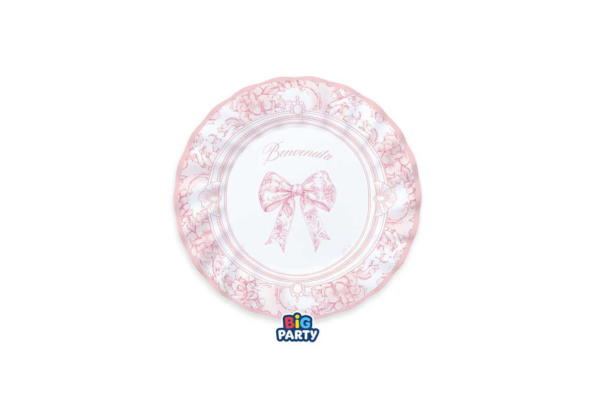 Piatti in carta “Benvenuta” con fiocco stile vintage da 20 cm, ideali per baby shower e nascita, firmati Big Party.