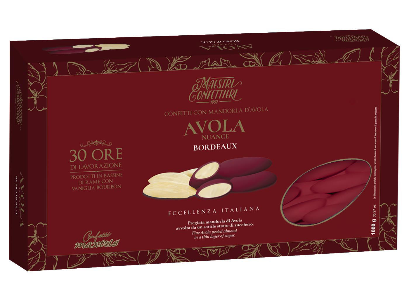 💍🍷 Tradizione e raffinatezza in un colore intenso. I Confetti Avola Nuance Bordeaux di Maxtris sono realizzati con pregiate mandorle Avola ricoperte da un sottile strato di zucchero. Confezione da 1 kg, contenente circa 240–260 confetti, perfetti per cerimonie ed eventi eleganti.