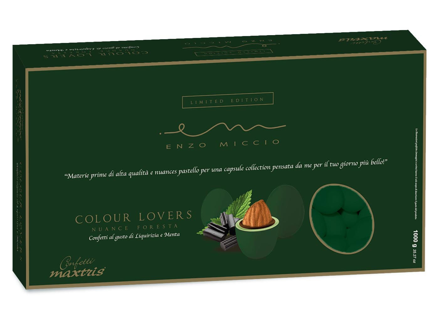 🌿🖤 Freschezza e carattere in una tonalità elegante. I Confetti Maxtris Enzo Miccio Nuance Verde Foresta offrono un sapore unico di liquirizia e menta, con una mandorla croccante rivestita da un sottile strato di zucchero. Confezione da 1 kg perfetta per eventi raffinati.