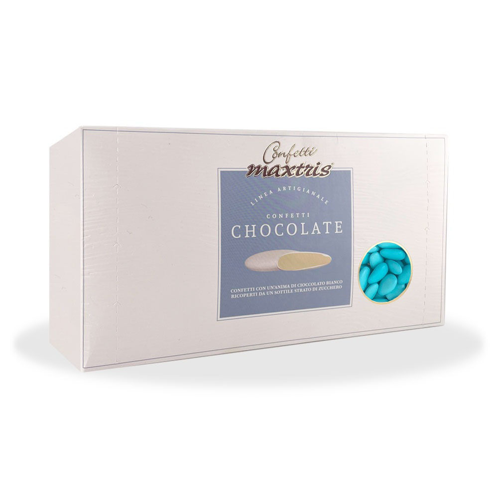 Confetti Maxtris al cacao azzurri 1 kg, ideali per battesimi, baby shower e confettate eleganti.