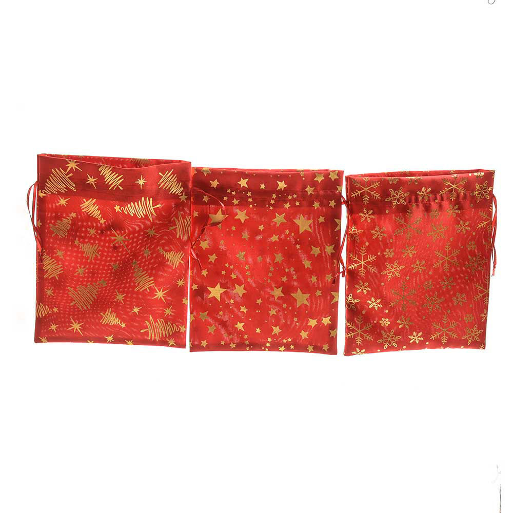 Sacchetto in tessuto laminato rosso con decori oro natalizi, misura 20x25 cm, ideale per confezioni regalo.