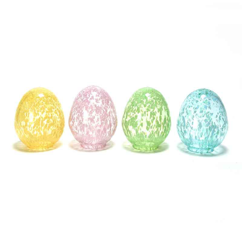 Uovo in vetro decorativo, diametro 10 cm, altezza 13 cm. Disponibile in colori assortiti e venduto singolarmente, è perfetto per decorazioni pasquali e allestimenti eleganti. Ideale come centrotavola o complemento d’arredo per aggiungere un tocco raffinato alla casa.