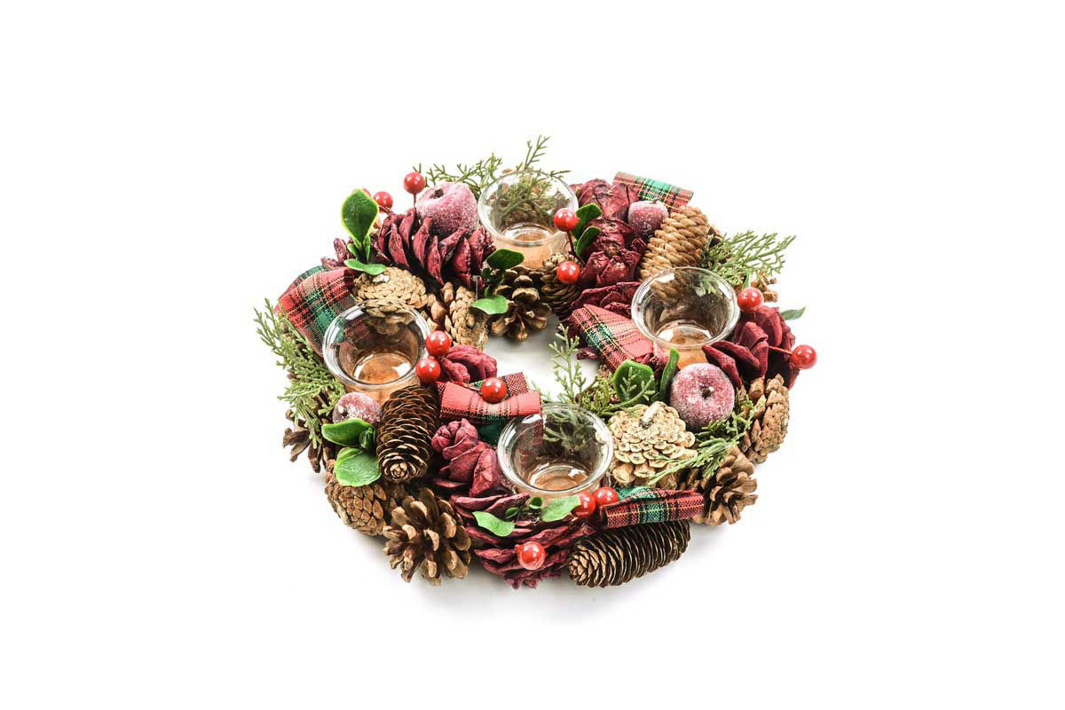Realizzato con decorazioni naturali come pigne, bacche rosse, foglie e nastri in stile tartan, combina colori tradizionali e dettagli ricercati tipici del periodo natalizio.