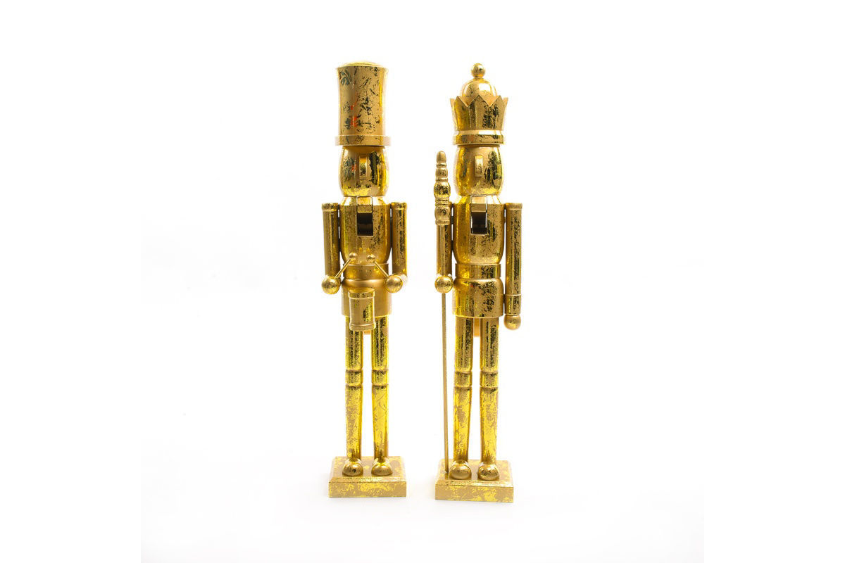 La figura, ispirata al classico schiaccianoci, presenta dettagli curati e una finitura dorata anticata che ne esalta la lucentezza, rendendolo perfetto sia come singolo pezzo sia abbinato ad altre decorazioni.