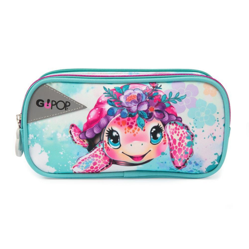 Astuccio 2 zip GoPop Turtle Bloom con stampa tartaruga, due ampi scomparti e dettagli funzionali. Ideale per la scuola primaria.