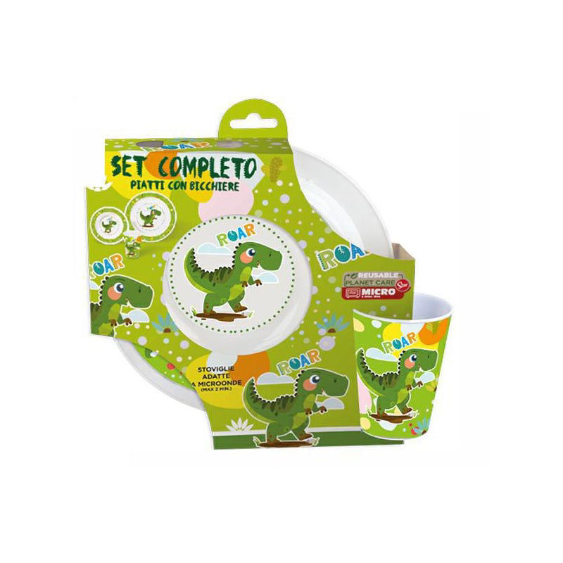 🦖🍽️ Divertente e pratico per ogni pasto! Il set completo Dinosauro comprende piatto piano, piatto fondo e bicchiere, tutti decorati con una simpatica grafica dinosauro. Adatti al microonde (max 2 minuti), ideali per bambini.