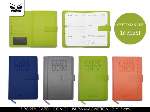 Agenda carpe diem professional 16 mesi 21x15 cm. Agenda della linea carpe diem in finta pelle con chiusura magnetica. Copertina rigida rivestita con tasca porta card/ documenti. Formato settimanale 16 mesi (Settembre 2022-Dicembre 2023).
