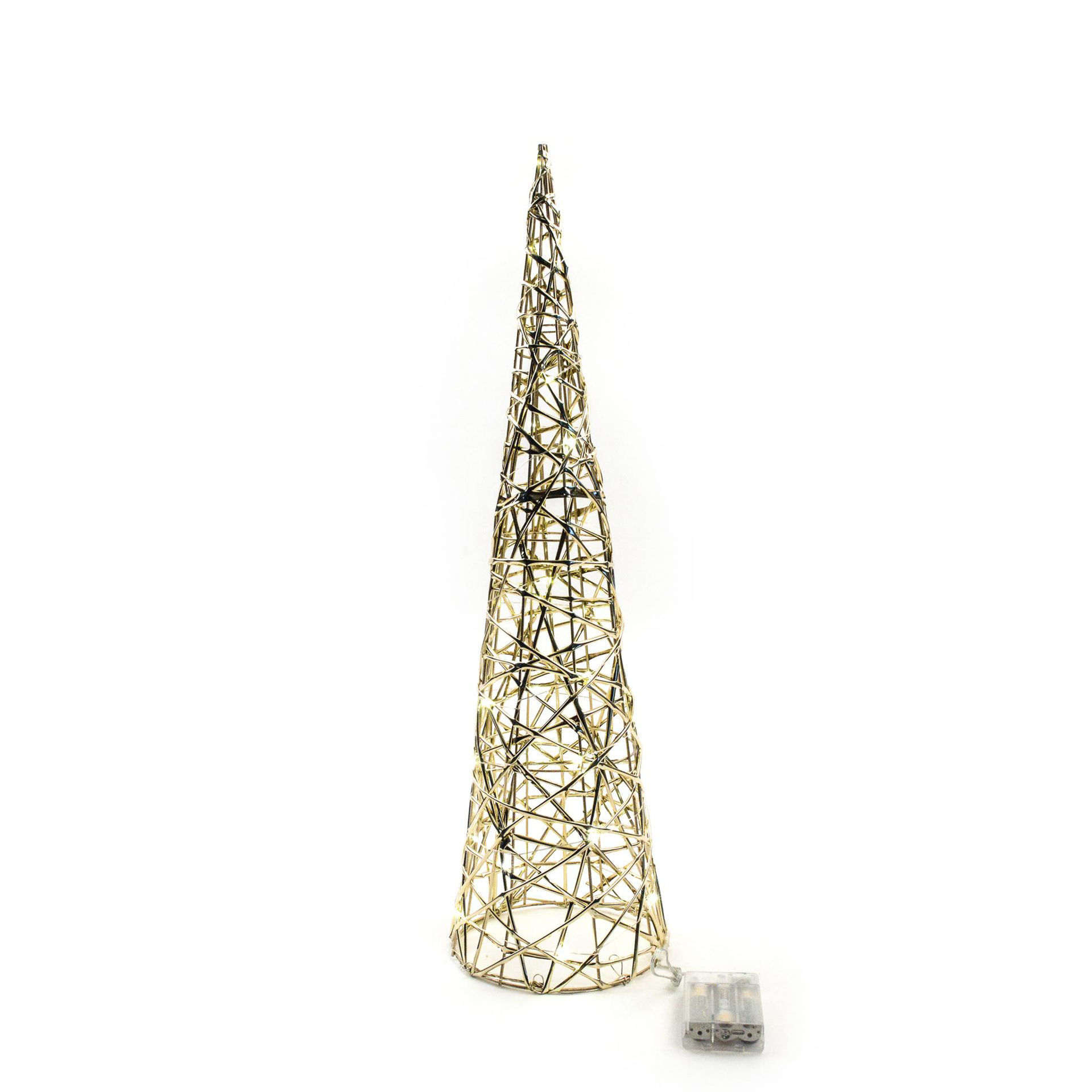 Albero cono oro in metallo con 30 luci LED a batteria, dimensioni D.16,5 x H.60 cm, perfetto per decorazioni natalizie luminose ed eleganti.