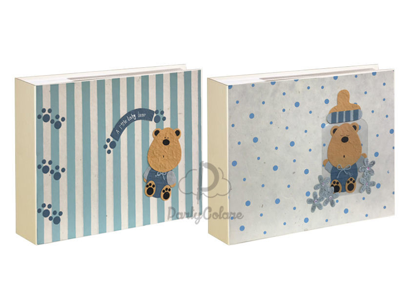 Album fotografico celeste di grandi dimensioni, con fantasie assortite a tema orsetto, ideale per conservare foto di nascita, battesimo e momenti speciali.