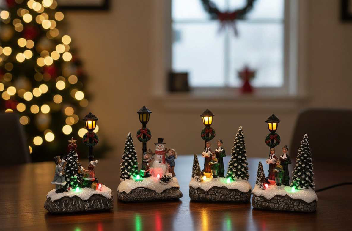 Scenografia natalizia con luci LED, musica e movimento, ideale per villaggi di Natale.