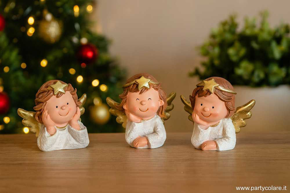 Angelo in resina 5,5 cm per allestire gli ambienti domestici ma anche vetrine e negozi in occasione delle festività. Realizzato in resina dipinta e il suo aspetto è molto realistico: sembra che indossi un vero abito. Decorato con ali dorare e trattiene tra le mani delle stelle sempre color oro. Degli oggetti di qualità artigianale da posizionare su mobili e scrivanie come decorazione Natalizia per la casa o da usare come idea regalo.