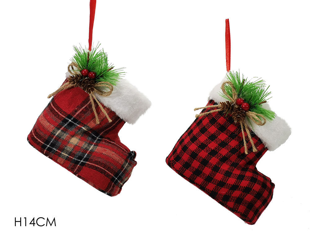 Applicazione decorativa a forma di stivale scozzese rosso, alta 14 cm. Venduta in 2 modelli assortiti, è perfetta per decorazioni natalizie e artigianato.