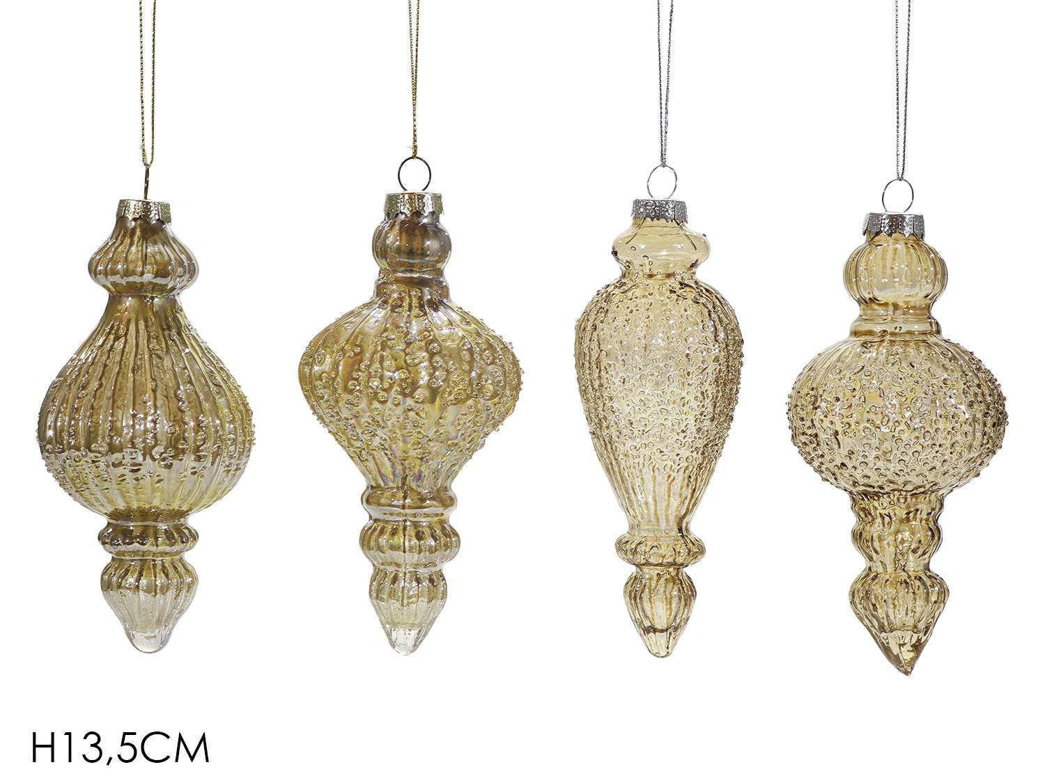 Appendino natalizio in vetro oro, altezza 13,5 cm. Disponibile in 4 modelli assortiti, con elegante finitura decorata.