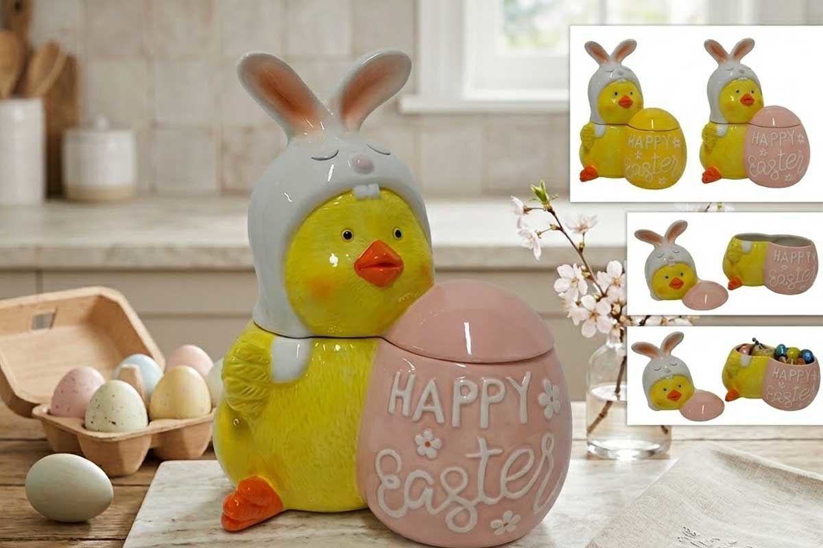 Il barattolo pulcino in ceramica con uovo è una decorazione pasquale originale e delicata, perfetta per arricchire la casa durante il periodo di Pasqua. Realizzato in ceramica e caratterizzato da un simpatico pulcino con uovo, questo barattolo decorativo unisce funzionalità e stile, diventando un elemento ideale per la tavola o per gli allestimenti primaverili.