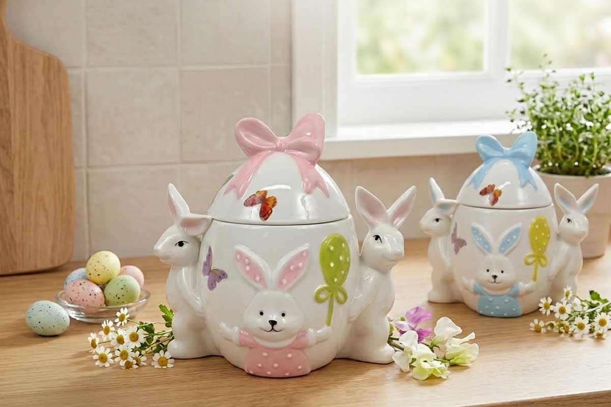 Barattolo a forma di uovo Ø 8 cm con coniglio e scenario pasquale. Perfetto come decorazione di Pasqua o piccolo contenitore per ovetti e dolcetti.