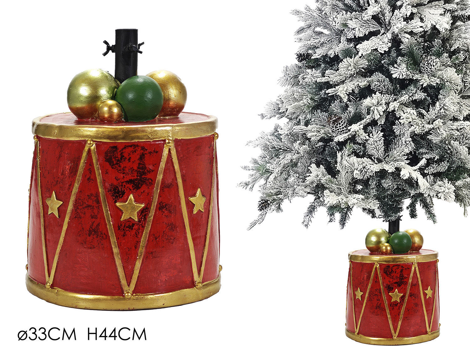 Base per albero di Natale a forma di tamburo rosso con dettagli dorati e decorazioni a sfera, dimensioni 33x33x44 cm, elegante e originale.