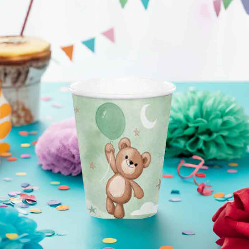 Bicchieri Teddy Bear in confezione da 8 pezzi. Bicchiere in carta ideale per realizzare un allestimento originale per una Festa a tema Orsacchiotto. Crea un kit personalizzato con tutti i nostri prodotti per Nascita, Battesimo e Primo Compleanno.