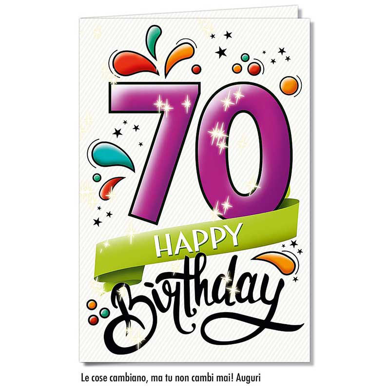 Festeggia i 70 anni di una persona speciale con questo biglietto d’auguri pieno di energia e colori vivaci. Decorato con grandi numeri scintillanti e la scritta “Happy Birthday”, trasmette tutta la gioia e la positività di un traguardo importante.