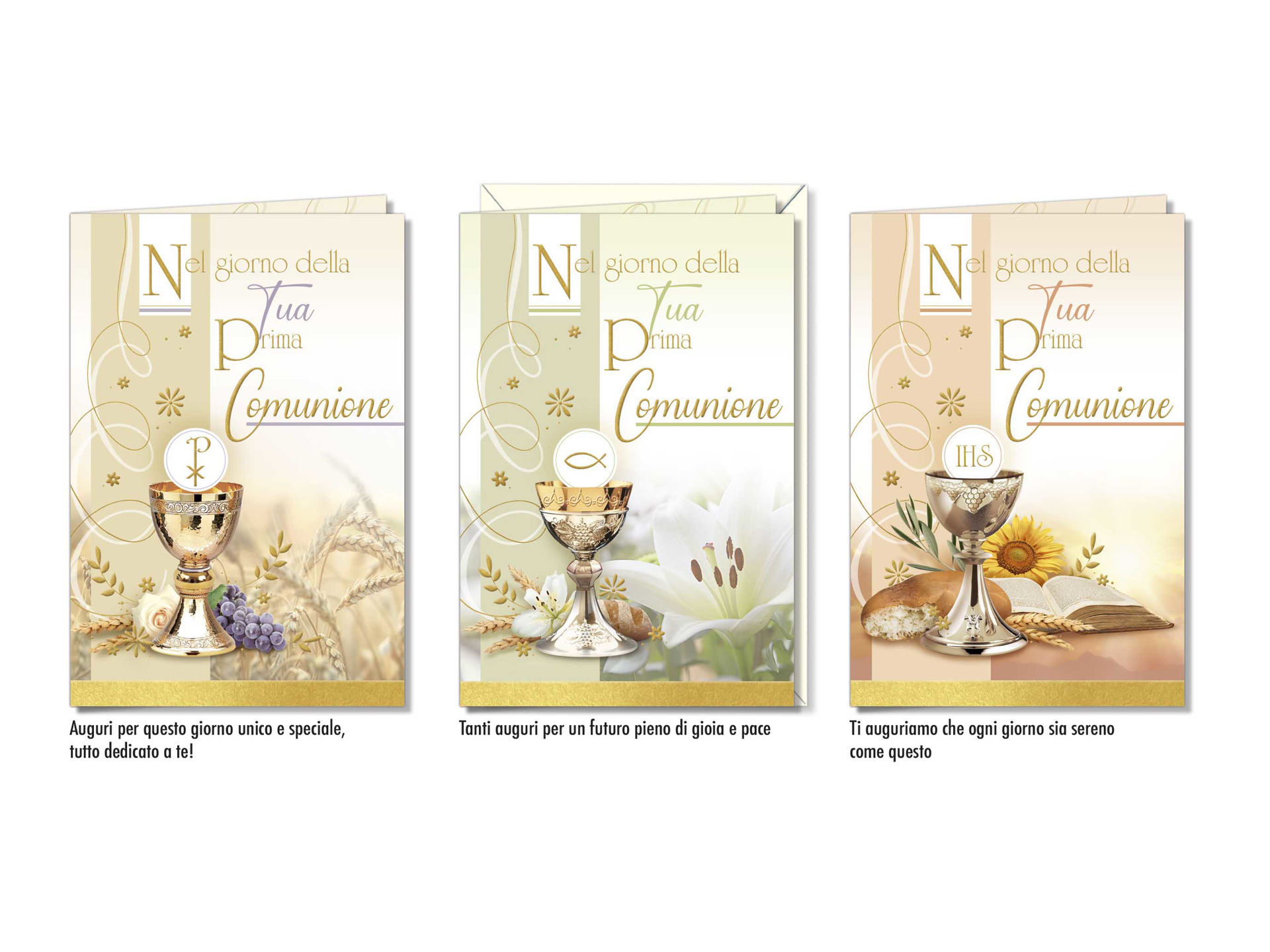 Biglietto di auguri per Comunione con tre soggetti simbolici, elegante e raffinato, ideale per celebrare una cerimonia speciale.