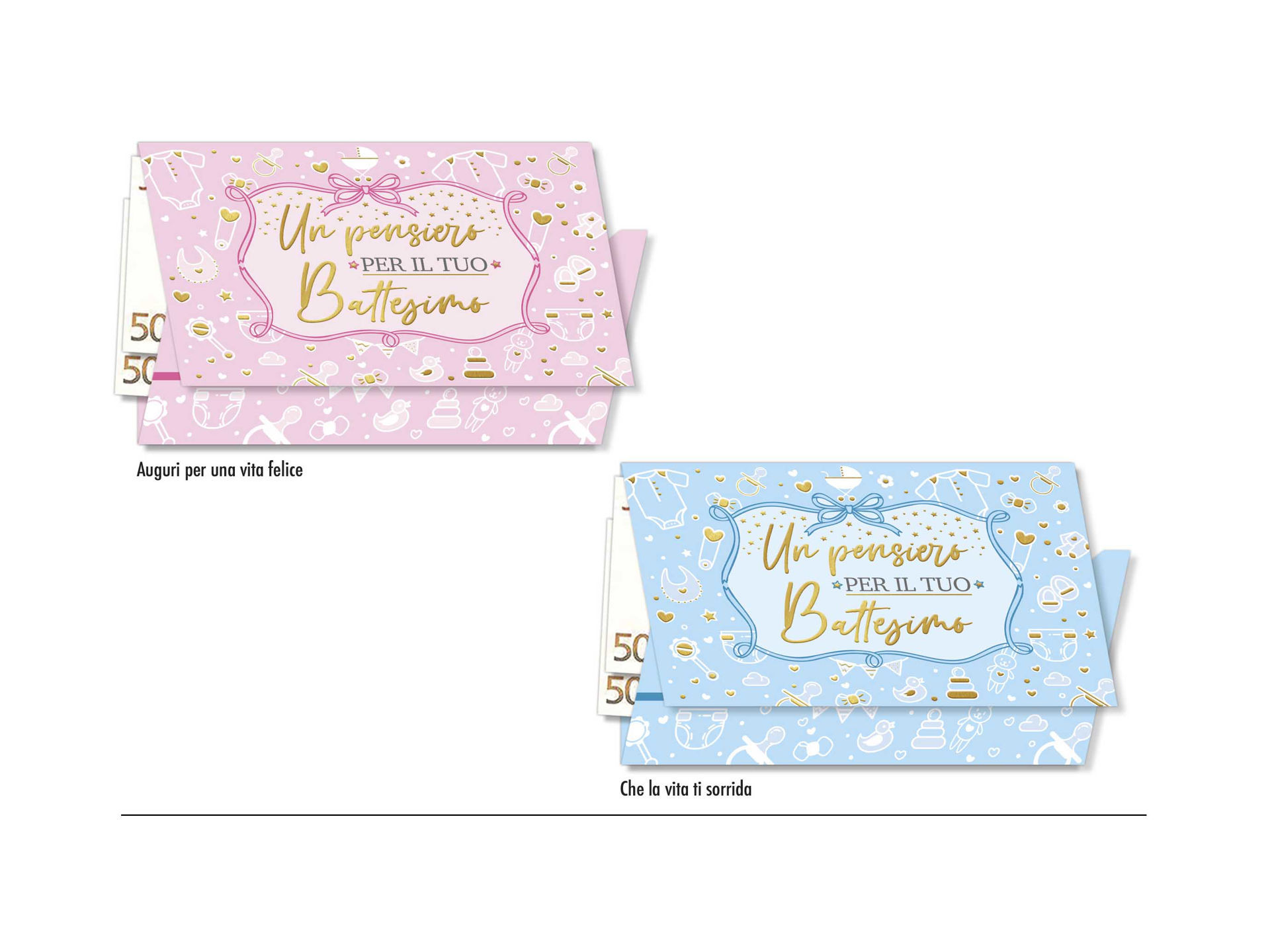 Biglietto portasoldi per Battesimo dolce ed elegante, ideale per accompagnare un regalo in denaro con un pensiero affettuoso.