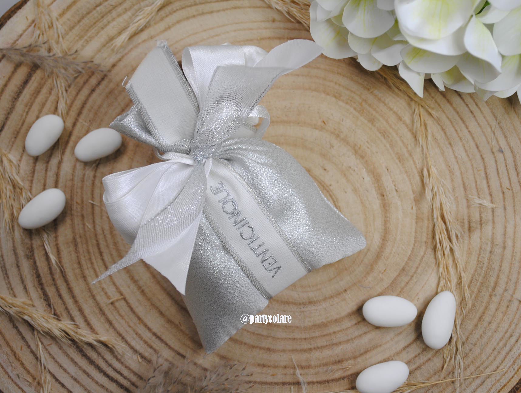 Celebra il tuo 25° anniversario di matrimonio con una bomboniera raffinata e luminosa. Il sacchetto in tessuto lamè argento, dal finish brillante ed elegante, è impreziosito da doppi fiocchi e un collarino in stoffa con scritta “Venticinque”.