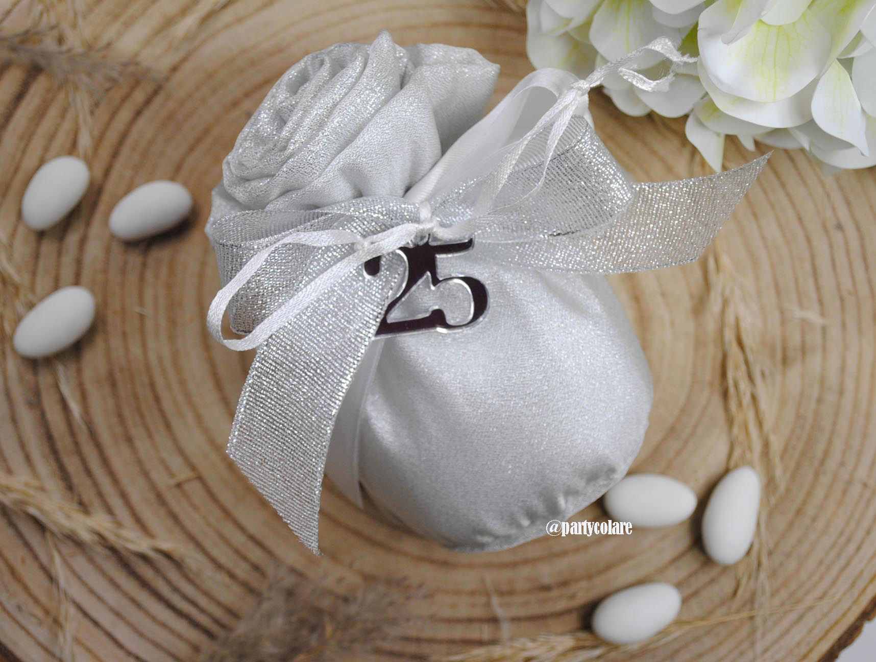 🥈🌹 Un'elegante rosa d’argento per celebrare l’amore che dura nel tempo. Bomboniera con sacchetto a forma di rosa in lamè argento, decorata con fiocco e ciondolo “25” in plexiglass, completa di confetti Maxtris e bigliettino personalizzabile