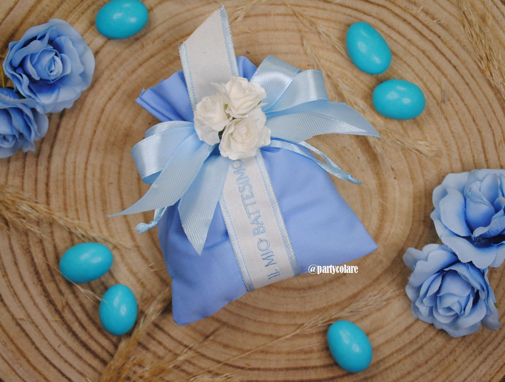 👶💙 Dolce e curata nei dettagli per il tuo bimbo. La bomboniera celeste è composta da un sacchetto in cotone, decorato con fiocchi, fiorellini bianchi e collarino “Il Mio Battesimo”, ed è completa di confetti Maxtris e bigliettino personalizzato.