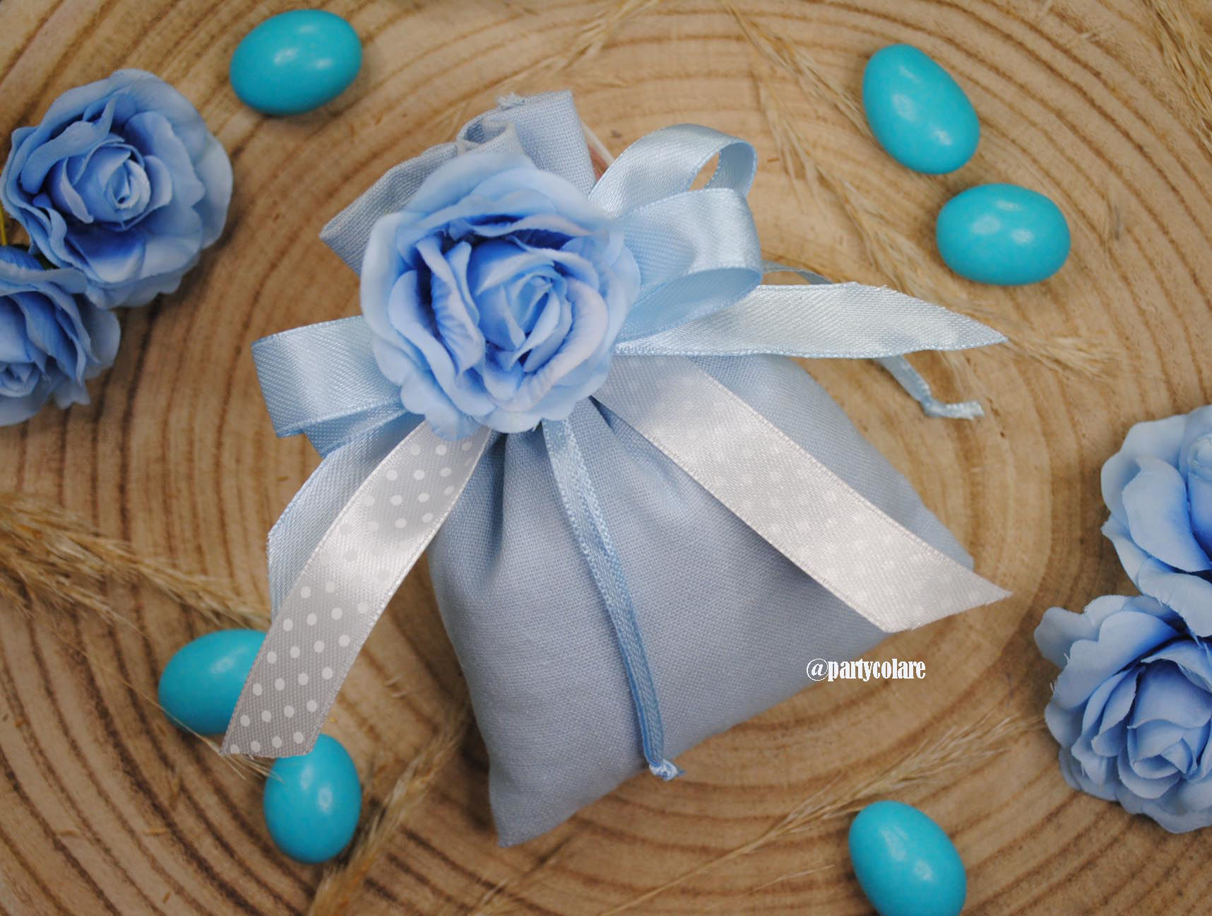 Questa bomboniera è pensata per celebrare con dolcezza i momenti più importanti del tuo bambino. Il sacchetto celeste, decorato con fiocchi in raso e un fiore tono su tono, dona eleganza e semplicità a qualsiasi evento.