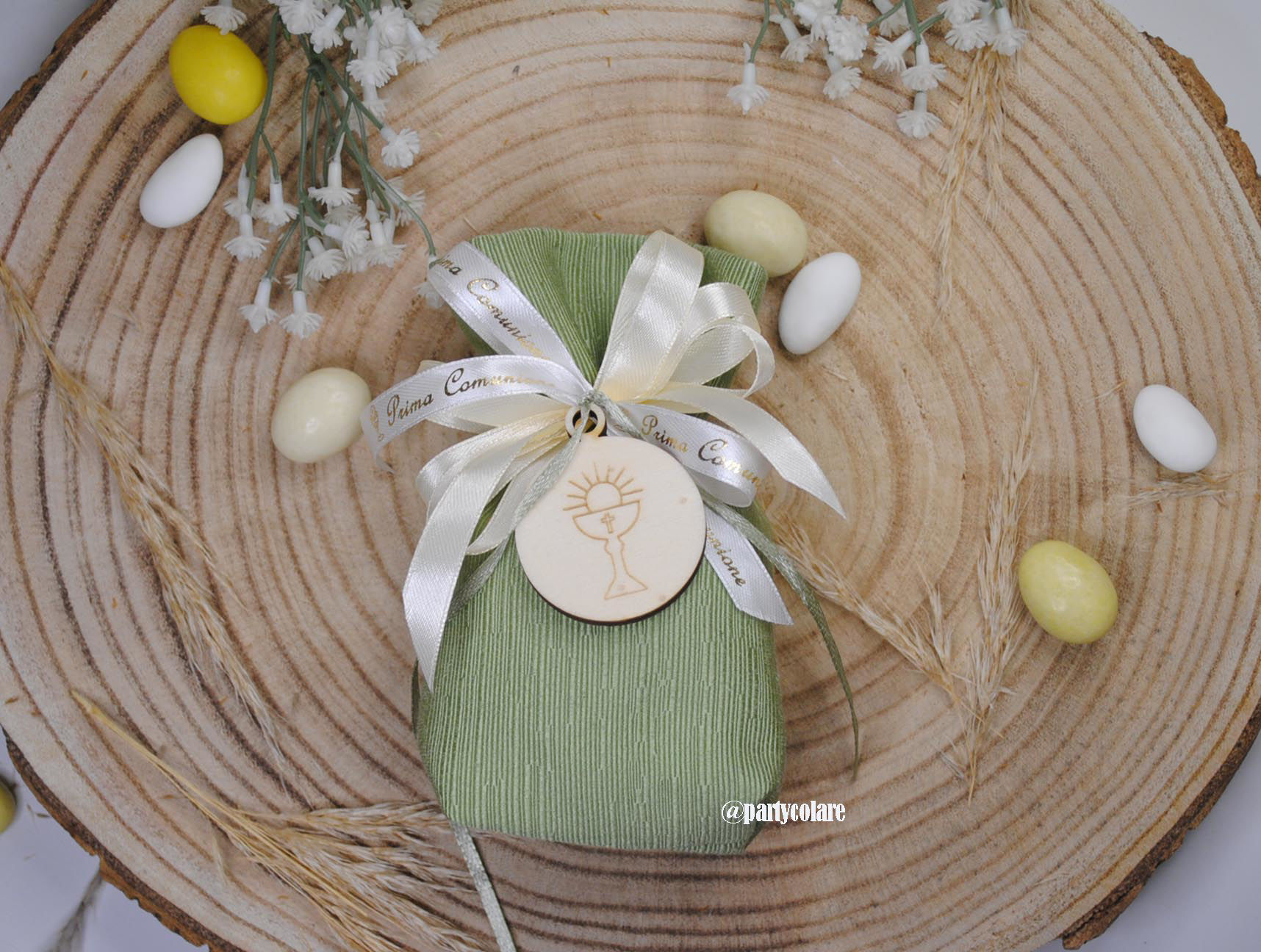 🕊️🎁 Una bomboniera curata nei dettagli per un giorno indimenticabile. Questa bomboniera Prima Comunione è completa di sacchetto in tessuto verde salvia, nastrini eleganti, applicazione in legno e confetti Maxtris. Inclusa anche la personalizzazione con nome e data.