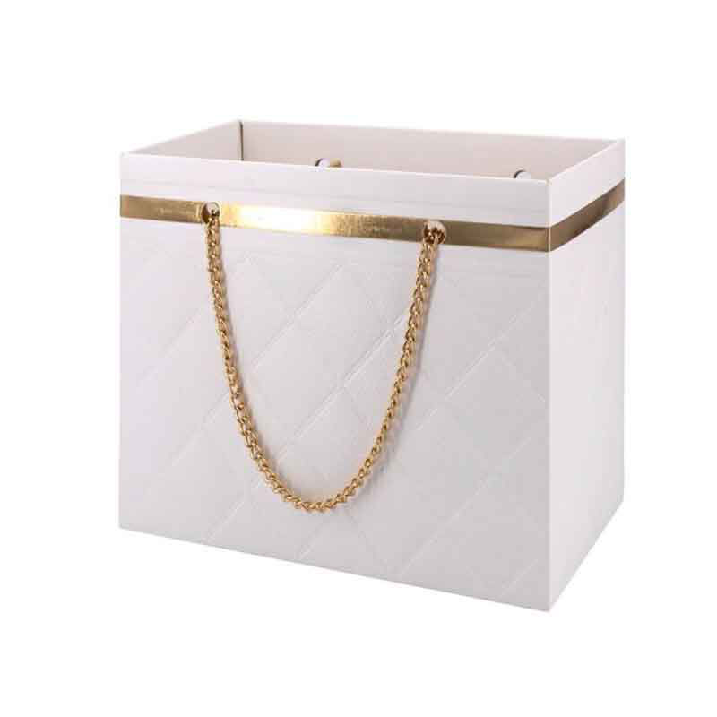 Borsetta in plastica bianca con catena, dimensioni 18x10x15 cm, elegante e versatile. Perfetta per confezionare regali o come accessorio decorativo, ad esempio con una piantina. Ideale per eventi, bomboniere e allestimenti raffinati, aggiunge un tocco di stile e originalità.