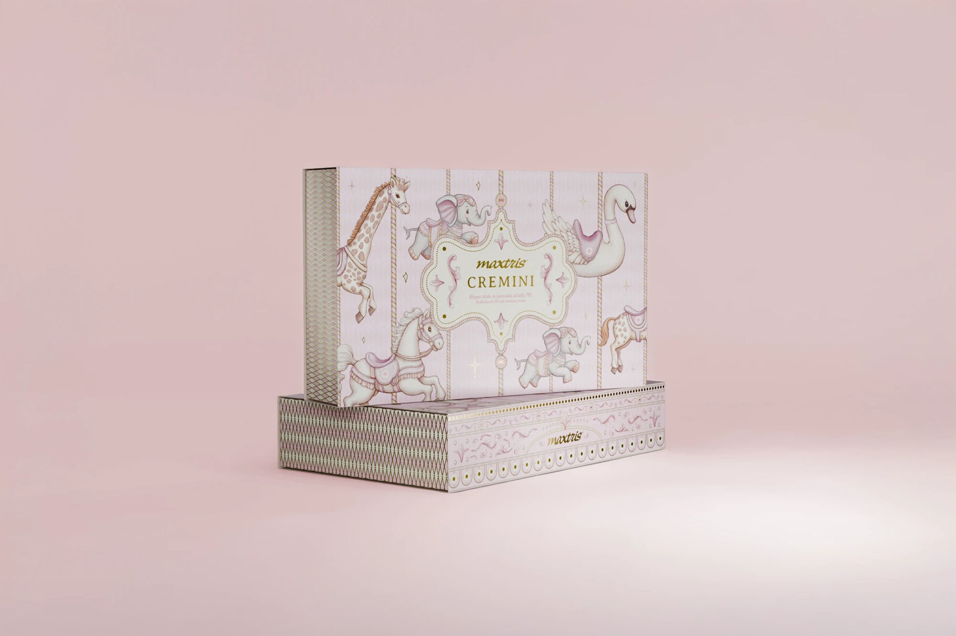La box da 350 g contiene circa 35 cremini incartati singolarmente, ideali da utilizzare come cioccolatini per confettata, dolci per bomboniere o piccoli pensieri golosi durante eventi speciali. Gli incarti nei delicati toni rosa presentano un mix di quattro illustrazioni – elefante, cigno, giraffa e cavallo, perfette per decorare sweet table, tavoli confetti e allestimenti per nascita o battesimo.