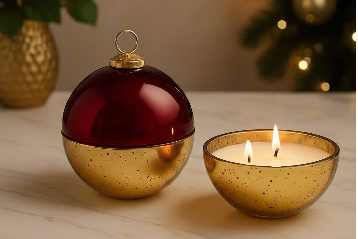 Candela profumata in elegante cofanetto a forma di palla di Natale in vetro oro e rosso. Idea regalo raffinata e decorazione natalizia di grande effetto.