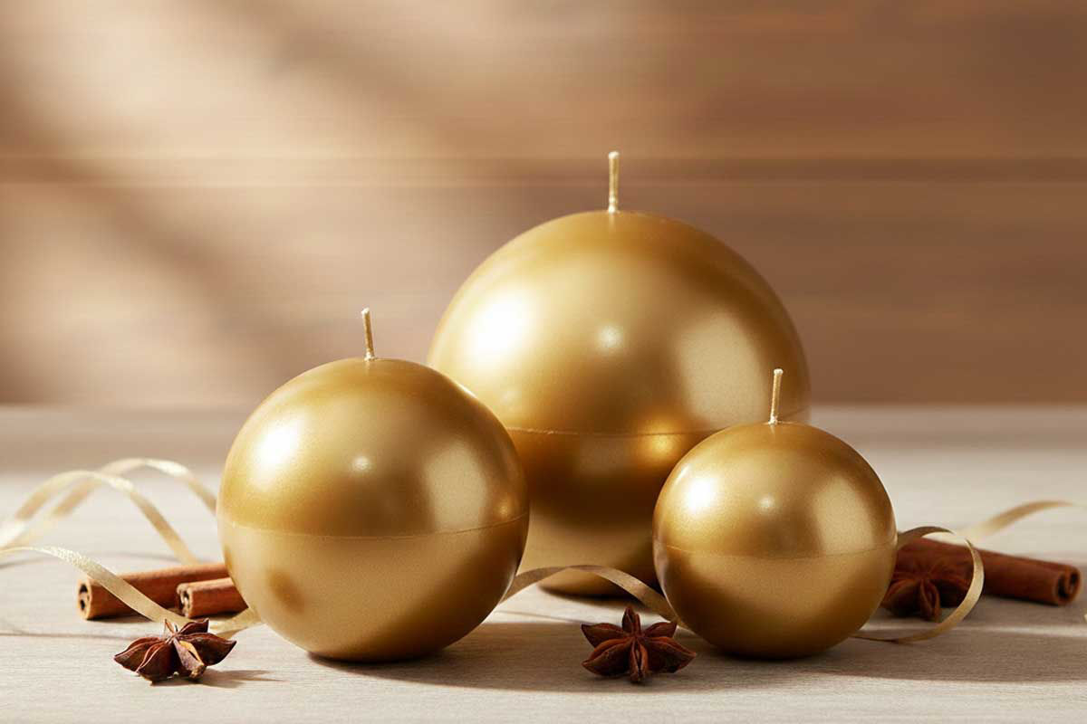 Candela sfera oro lucido elegante e decorativa, ideale come candela rotonda dorata d’arredo per casa, tavola ed eventi. Disponibile in più misure selezionabili singolarmente direttamente in basso, per adattarsi a ogni esigenza decorativa.