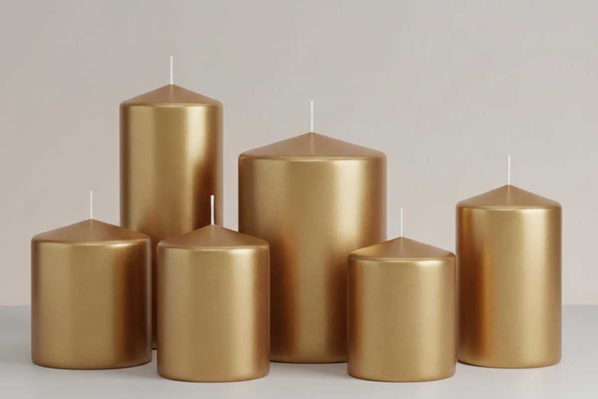 Candela cilindro oro elegante e decorativa, ideale come candela dorata d’arredo per casa, tavola ed eventi. Disponibile in più misure selezionabili singolarmente direttamente in basso, per adattarsi a ogni esigenza di stile e composizione.