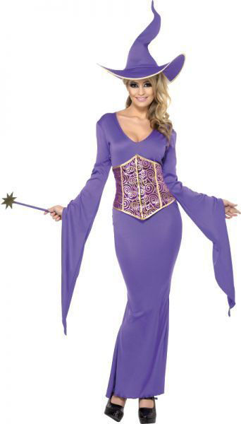 Costume (vestito) di Carnevale da Adulto per il travestimento da Strega Viola con Corsetto e Cappello Taglia L
