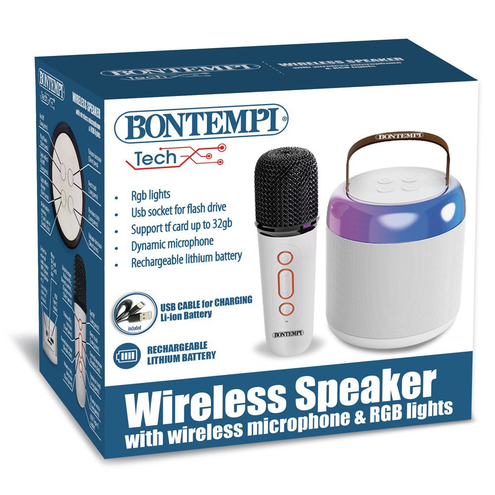 Cassa acustica wireless Bontempi con microfono senza filo e luci RGB, ideale per karaoke, feste ed eventi musicali.