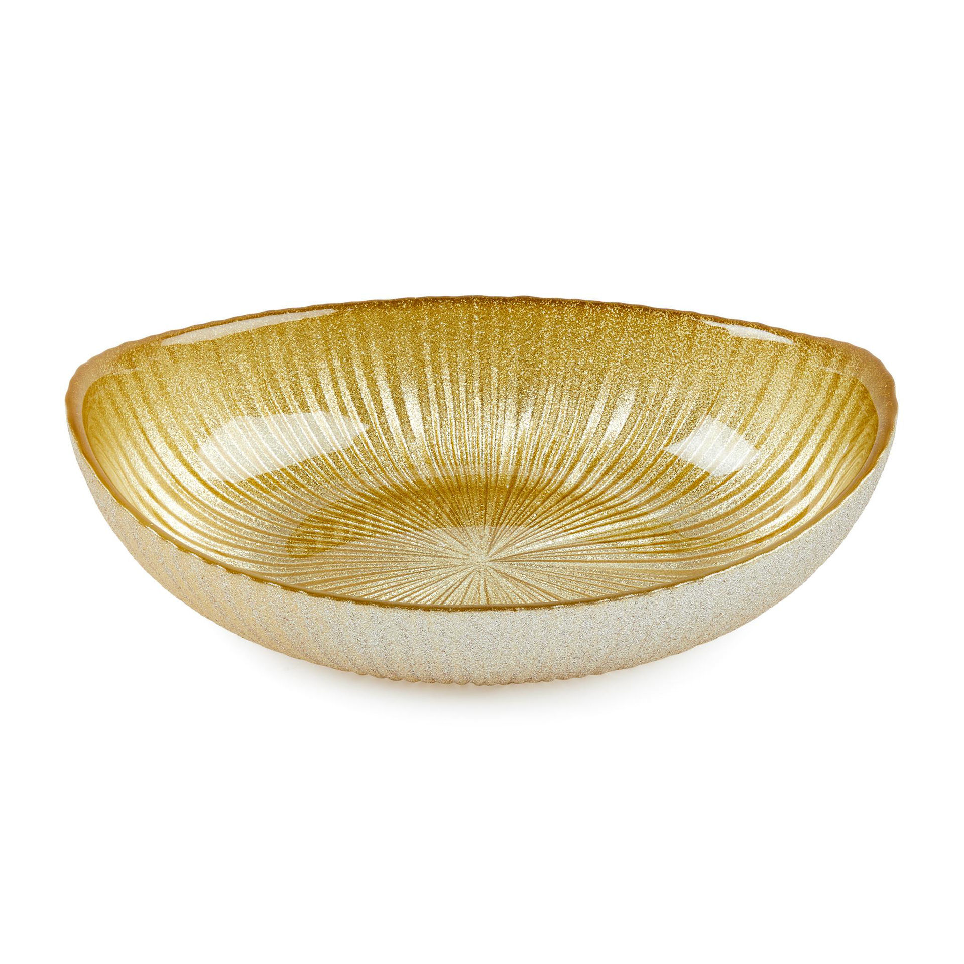 Ciotola ovale oro in vetro. Dimensioni: 21x13,5xH.6 cm. Elegante e decorativa, perfetta per impreziosire la tavola delle feste.