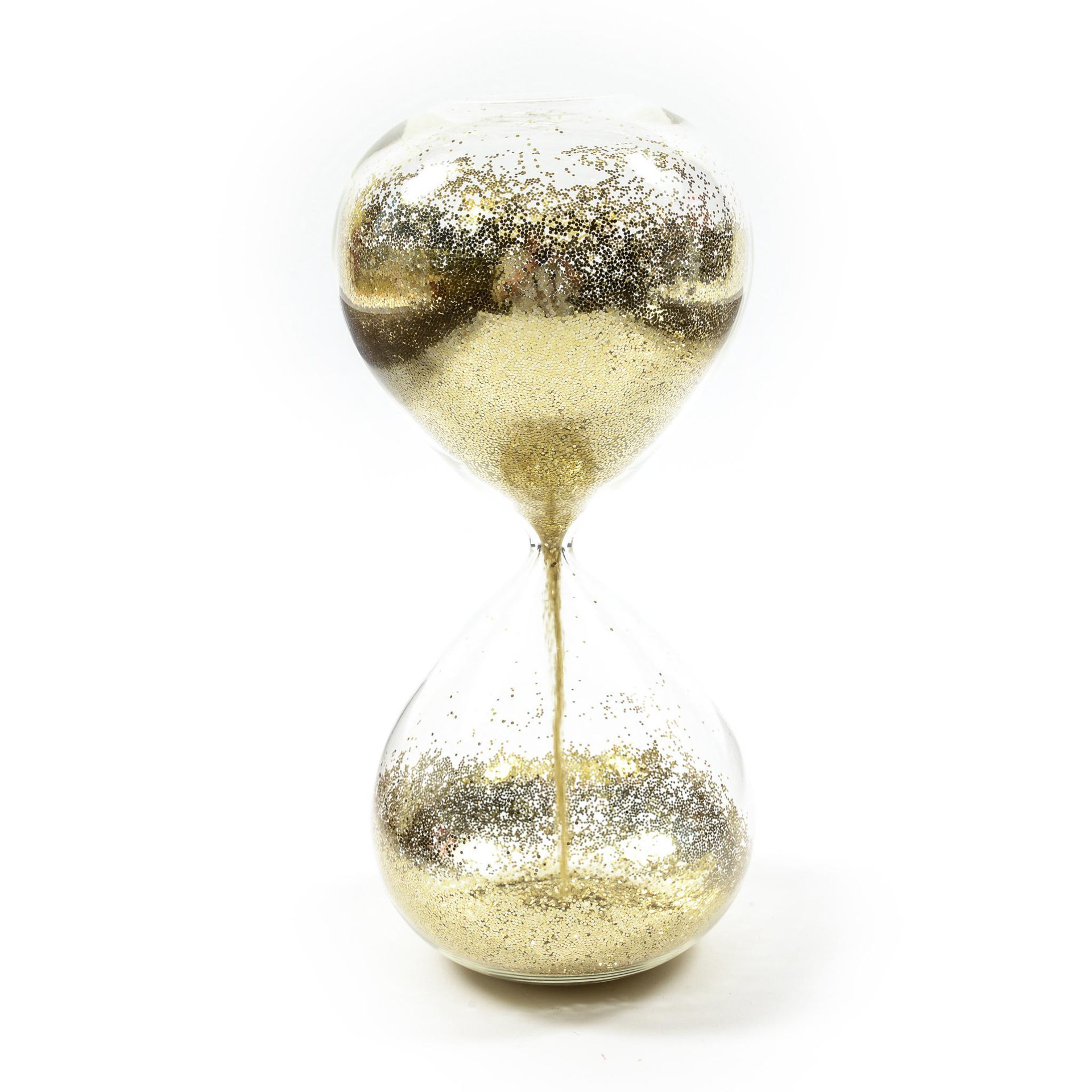 Clessidra decorativa in vetro con glitter dorati. Dimensioni: Ø 8 x H.20 cm. Elegante complemento d’arredo.