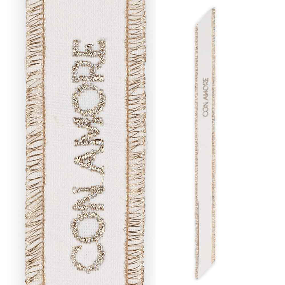 Un dettaglio che parla dal cuore. Il collarino in stoffa con scritta “con Amore” in oro è perfetto per completare con eleganza bomboniere, sacchetti, confezioni regalo e pensieri speciali. Misura 35 cm x 2,5 cm.