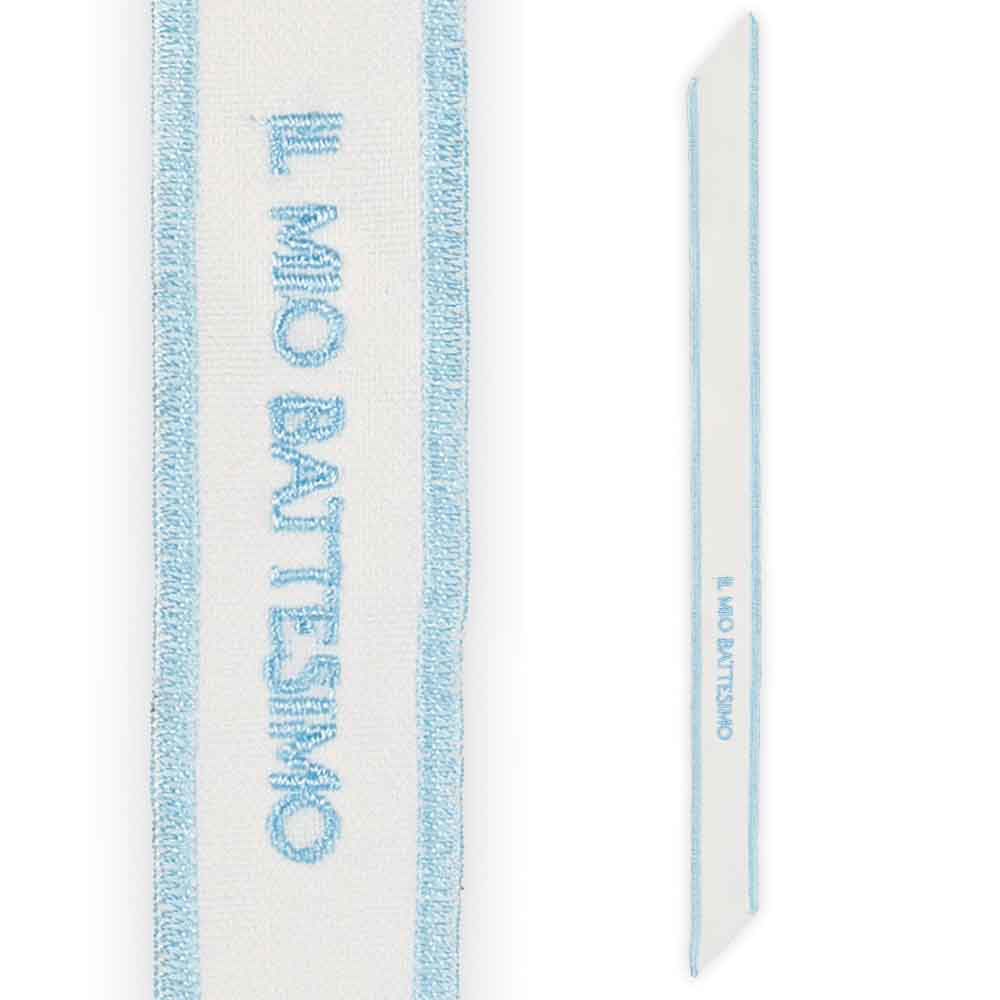 Un dettaglio dolce per un giorno speciale. Il collarino in stoffa azzurro con scritta "Il Mio Battesimo" è perfetto per decorare bomboniere, sacchetti e confezioni regalo dedicate al battesimo di un bimbo. Misura 35 cm di lunghezza e 2,5 cm di larghezza.