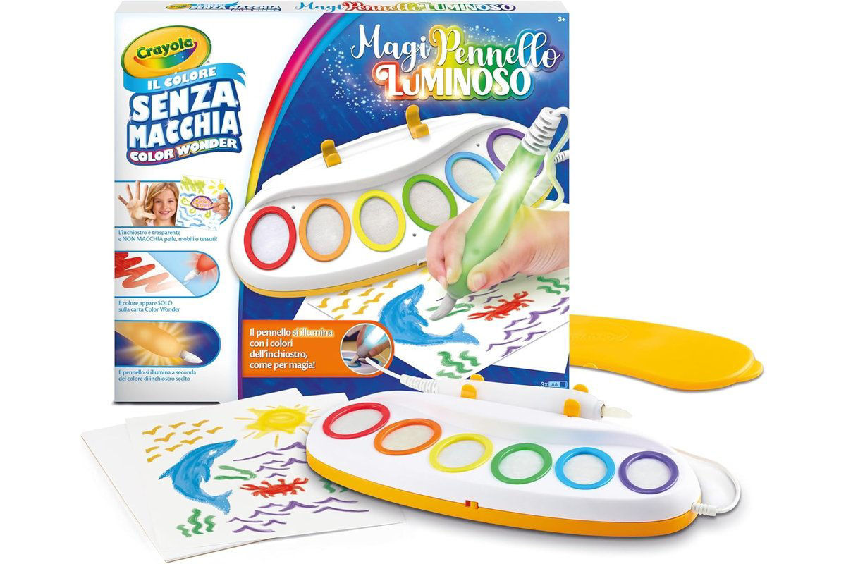 Il Magico Pennello Luminoso Color Wonder permette di dipingere senza macchiare grazie agli inchiostri trasparenti che appaiono solo sulla carta speciale, con il pennello che si illumina del colore scelto.
