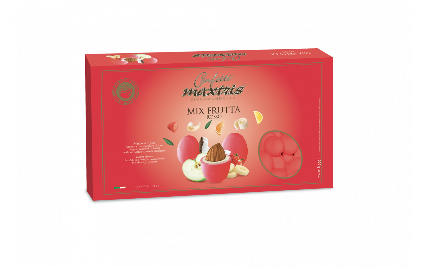 I confetti Maxtris Frutta Rossi sono realizzati con mandorla tostata, avvolta da cioccolato bianco aromatizzato ai gusti frutta: amarena, fragola, banana, arancia, cocco, limone e mela verde. Ricoperti da un sottile strato di zucchero, si distinguono per il loro colore rosso vivace e la qualità del gusto.