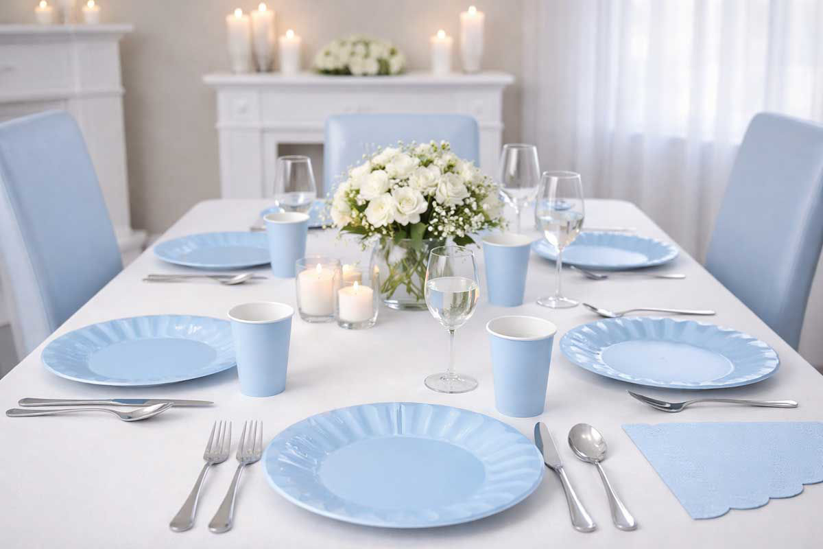 Il coordinato tavola Wavy Celeste Baby illumina l’allestimento con toni delicati perfetti per eventi dedicati ai più piccoli. Bicchieri, piatti e tovaglioli coordinati rendono la festa elegante e armoniosa. In basso puoi selezionare misure e quantità.