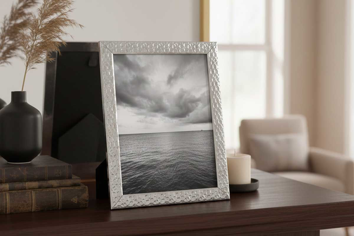 Cornice elegante in metallo argento per foto 20x25 cm. Design raffinato, perfetta per valorizzare ricordi speciali con stile.