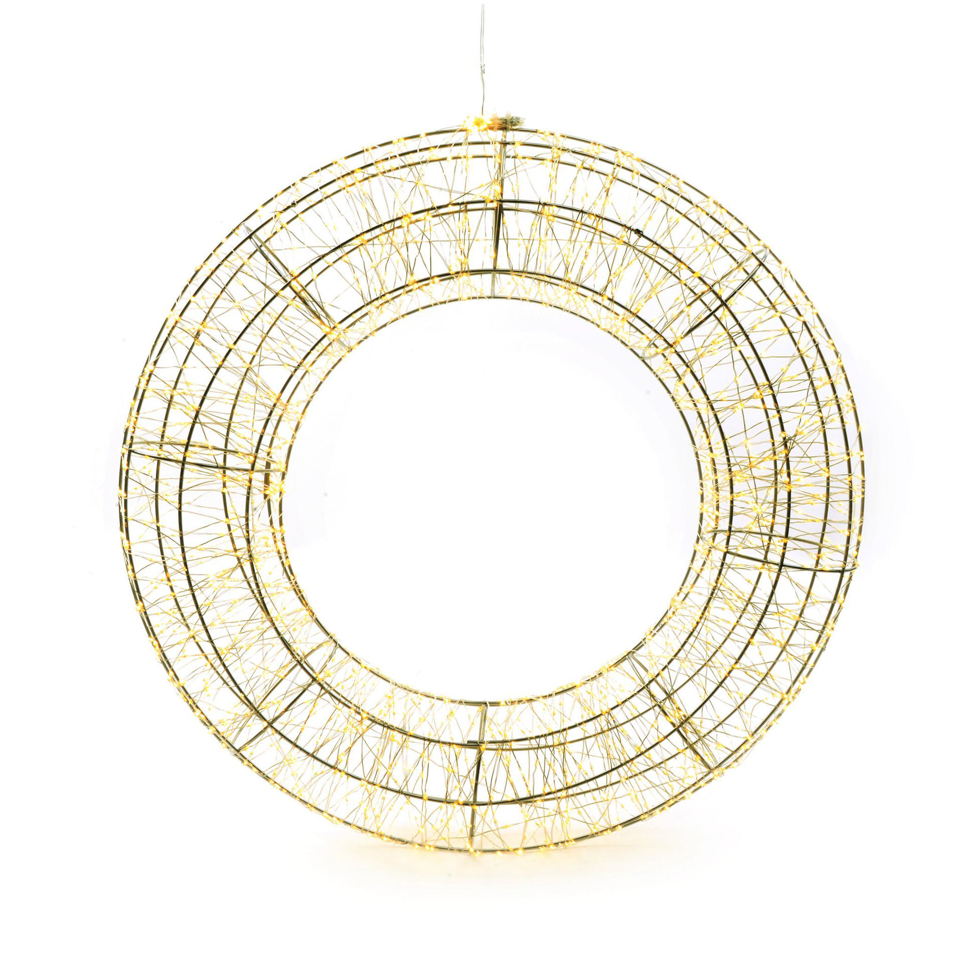 Corona in metallo luminosa con 1800 luci LED calde, trasformatore IP20 12V 9W. Dimensioni D.58xH.58 cm. Uso interno.